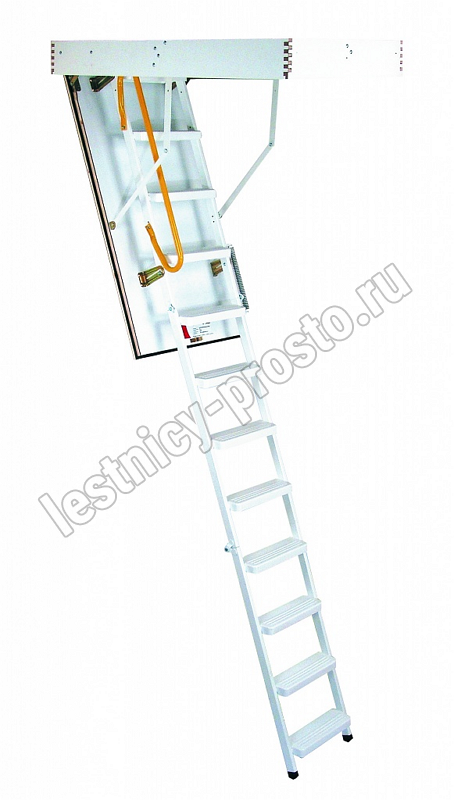Износоустойчивая лестница для холодных помещений, приспособлена, как для частого использования так и для продолжительного простаивания. Белый цвет крышки люка (толщина 3,3 см) гармонично интегрируется в интерьер помещения и закрывается, маскируясь в один уровень с потолком.