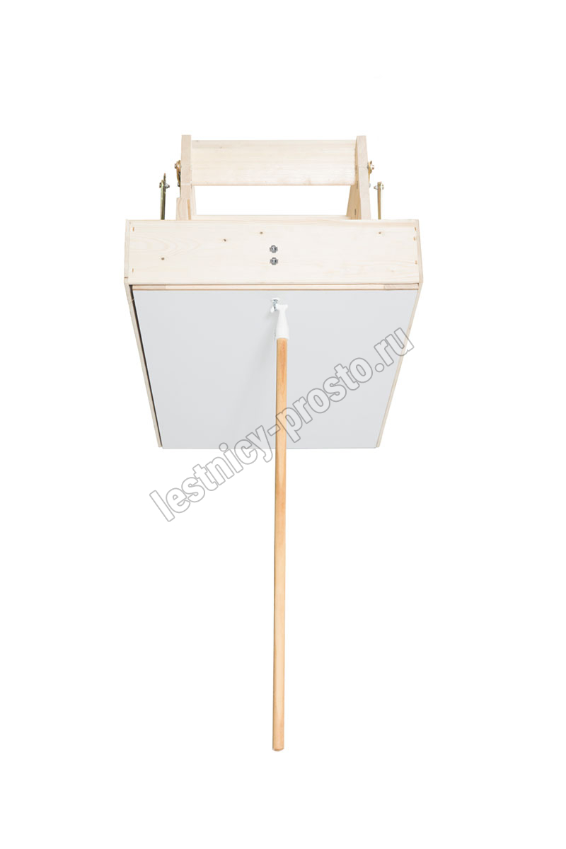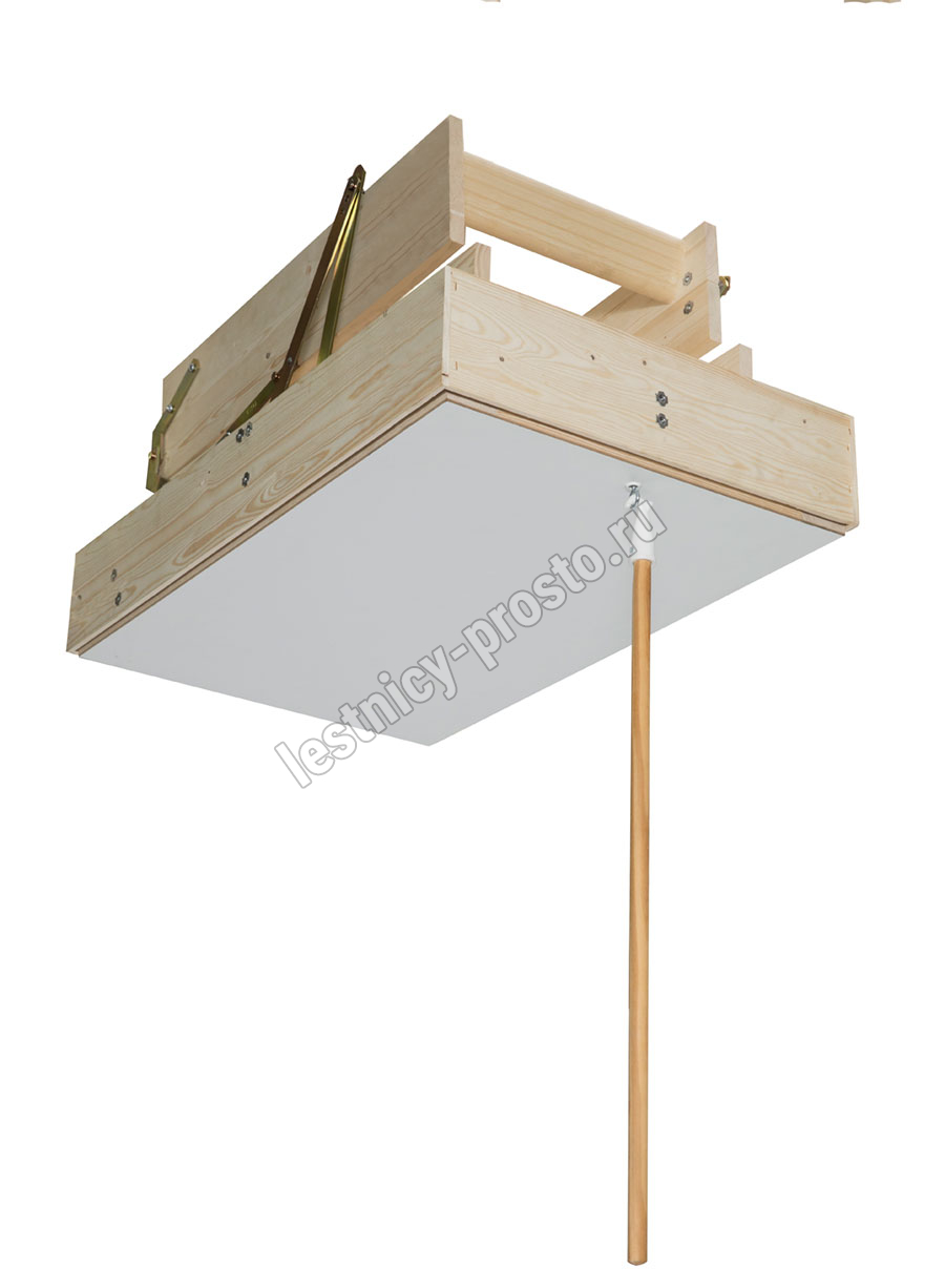 В комплекте: люк из сэндвич-панели, пружинный механизм "короб-рычаг", короб, четырехсекционная лестница с буковыми ступенями, замок люка, штанга для раскладывания лестницы, наконечники для ножек