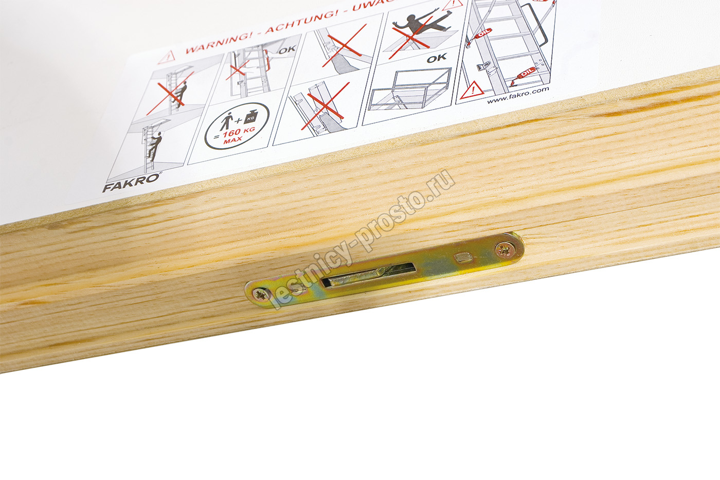 Соединение тетивы боковых элементов и ступеней лестницы в крепление «ласточкин хвост» гарантирует надежность и прочность конструкции. Ступени не соприкасаются с крышкой лестницы, а противоскользящие выемки обеспечивают комфорт и безопасность использования. Монтажный комплект LXK приобретается отдельно.