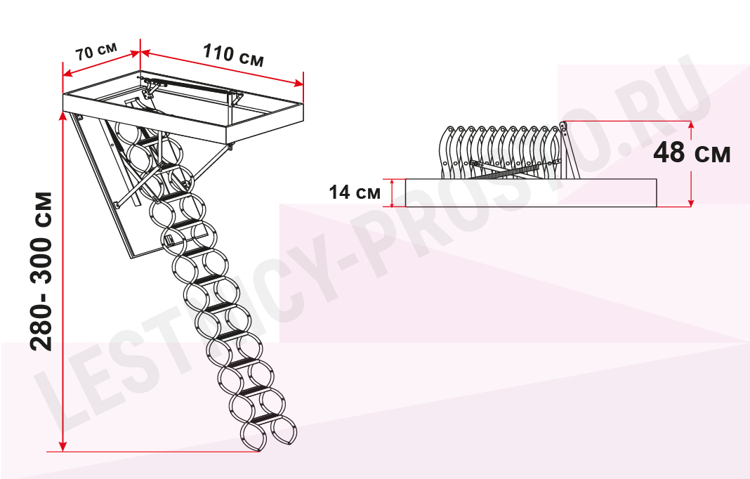 Лестница предназначена к установке в помещениях с высотой потолка 320 см, дополнительная секция позволяет увеличить высоту лестницы.