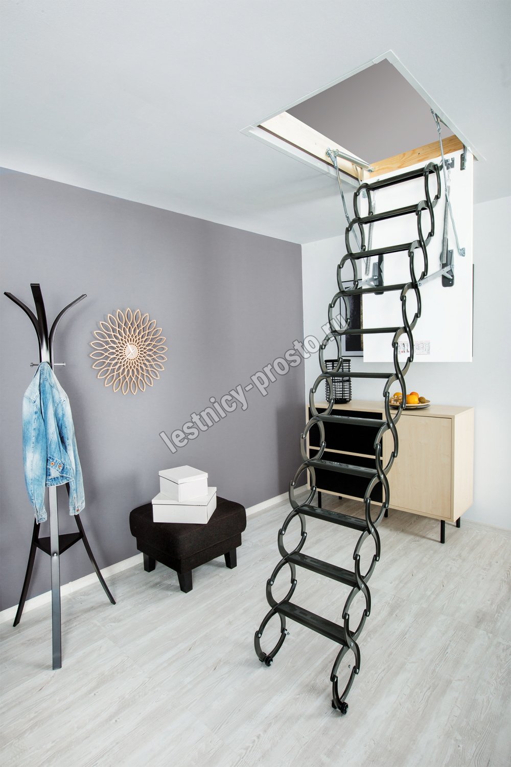 Металлическая чердачная лестница LST оснащена энергосберегающей термоизоляционной крышкой люка белого цвета. По периметру люка установлен контур уплотнения, обеспечивающий высокую степень герметичности. Благодаря «ножничной» системе складывания в сложенном виде лестница очень компактна и имеет небольшой размер крышки люка. S-образные боковые элементы лестницы выполняют роль поручней и придают лестнице современный вид.