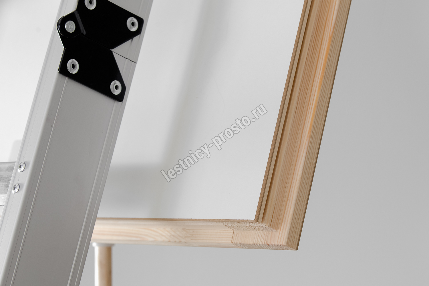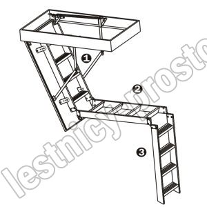 Складная 3-х секционная чердачная лестница. Рабочая поверхность полностью выполнена из алюминия. Термоизоляционная крышка типа "сэндвич" имеет усиленную теплозащиту, облицована с двух сторон ДВП белого цвета. По контуру короба имеется уплотнитель; Все металлические элементы лестницы покрыты порошковой краской.