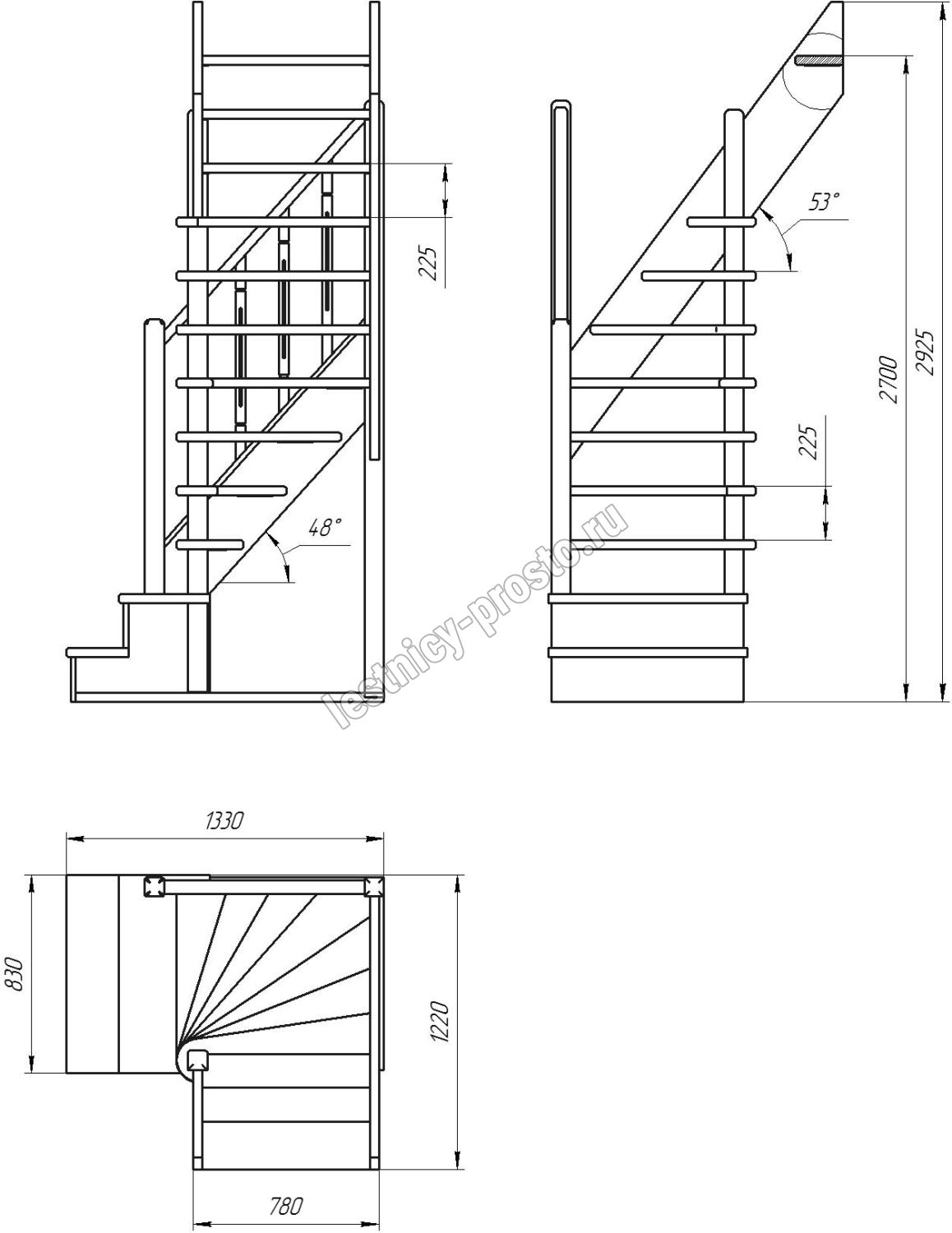 Деревянная межэтажная лестница ЛЕС-91 2700-2925 проем 1220-780, Сосна