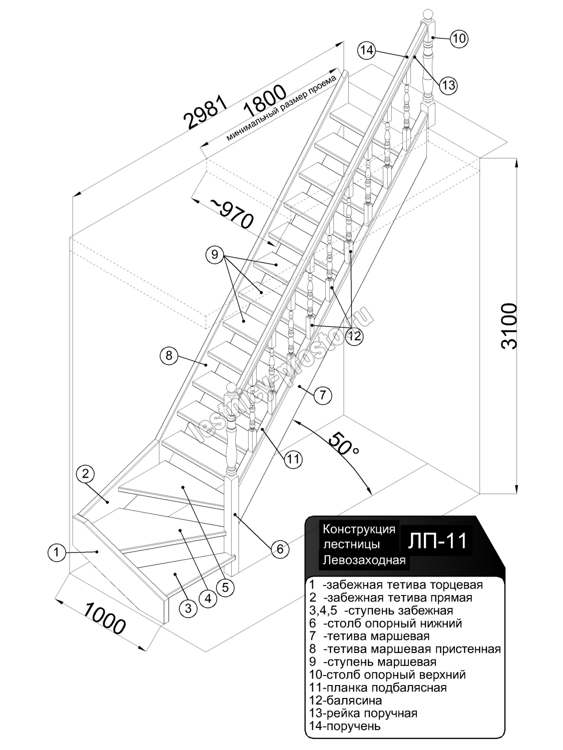 Классическая деревянная лестница с удобным забежным поворотом. Лестница без какого-либо покрытия. В комплекте элементы лестницы и ограждения в разобранном виде, необходимый крепеж, инструкция по сборке.