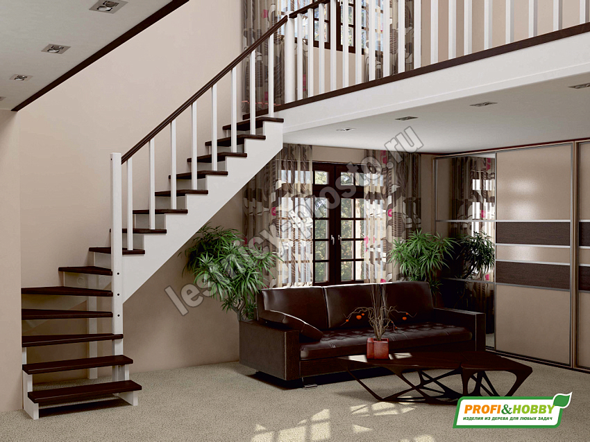 Базовый комплект включает в себя деревянные элементы лестницы и ограждения без какого-либо покрытия. Вы можете заказать у нас покраску лестницы в цвета, отвечающие особенностям вашего помещения.