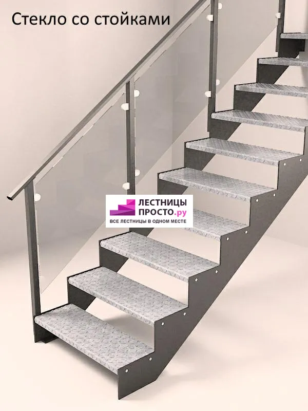 Покрытие порошковое, очень прочное и долговечное. Все детали каркаса крепятся с помощью болтов, благодаря чему Вы можете собрать каркас самостоятельно без применения сварки. В зависимости от ширины лестницы, каркас состоит из двух (ширина до 1 метра) или трех (ширина до 2 метров) опорных балок (тетив).