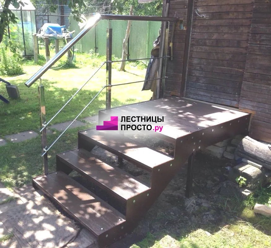 Ступени лестницы состоят из металлической рамки, обеспечивающей необходимую прочность, и покрытия из террасной доски ДПК (древесно-полимерный композит). Ступени не боятся воды и мороза, не теряют со временем свой внешний вид и не требуют ухода.