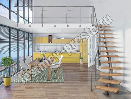 Лестница на стальном модульном каркасе. Высота лестницы регулируется при сборке засчет регулировки высоты шага. Ступени покрыты защитным лаком. Ограждение из стали с пластиковым поручнем. В комплект входят перила с вертикальными стойками и горизонтальными перегородками. Изделие поставляется с шурупами (кроме потолочных и напольных анкеров), инструкциями по монтажу и эксплуатации и гарантией. Внимание! Для этой лестницы необходимо крепление к стене.