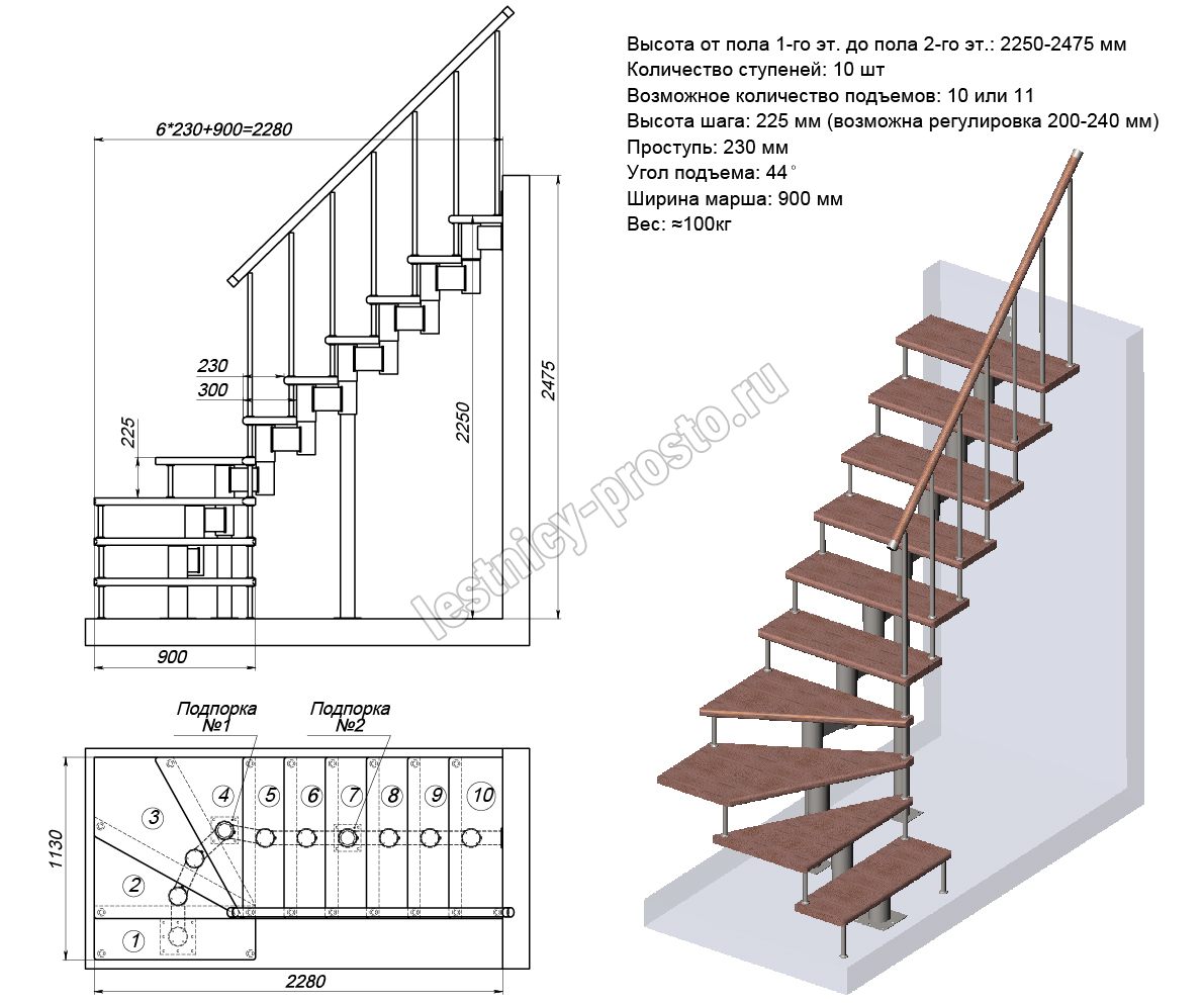 Высота лестницы 2250 - 2475 (10 ступеней) мм