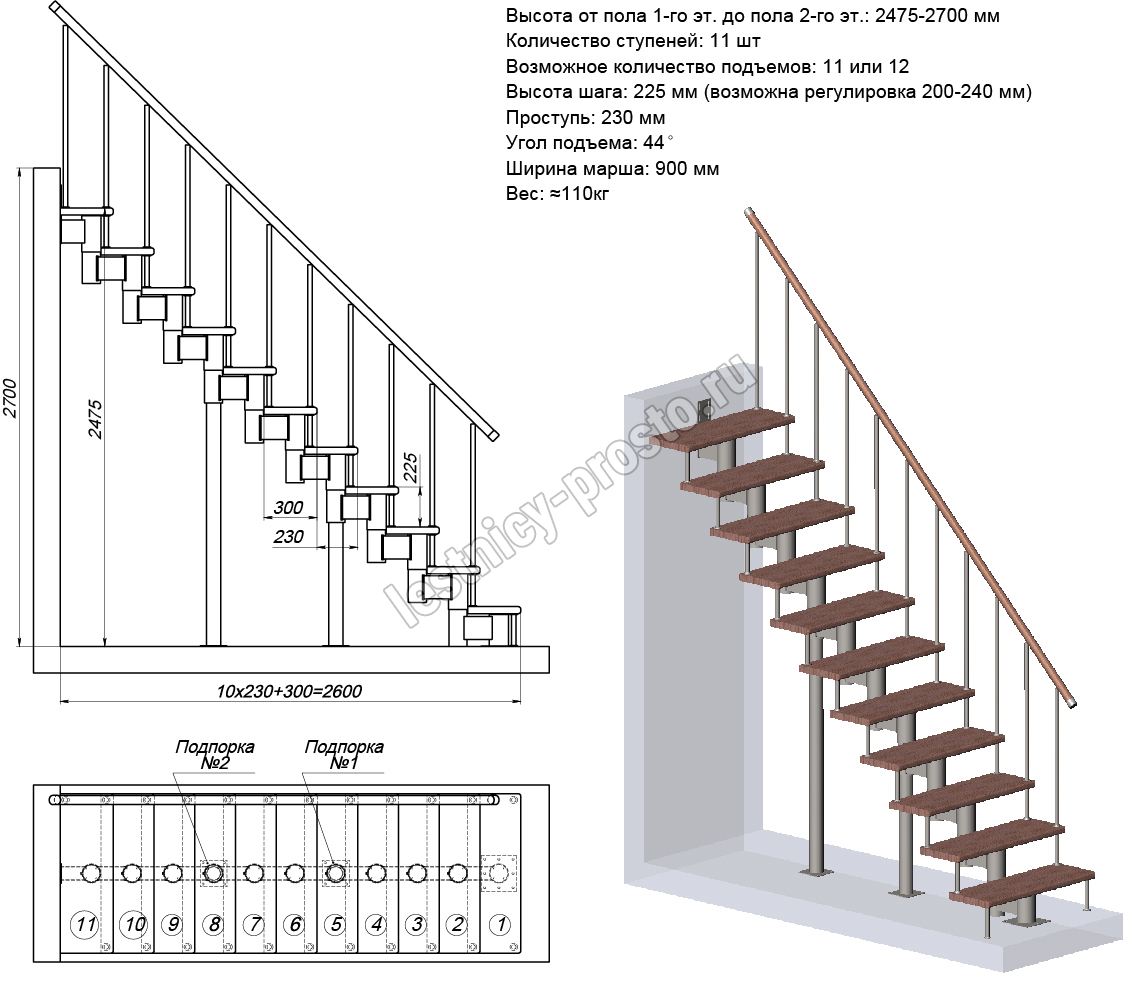 Универсальная, модульная лестница позволяет при сборке регулировать высоту шага в диапазоне  200 - 240 мм.