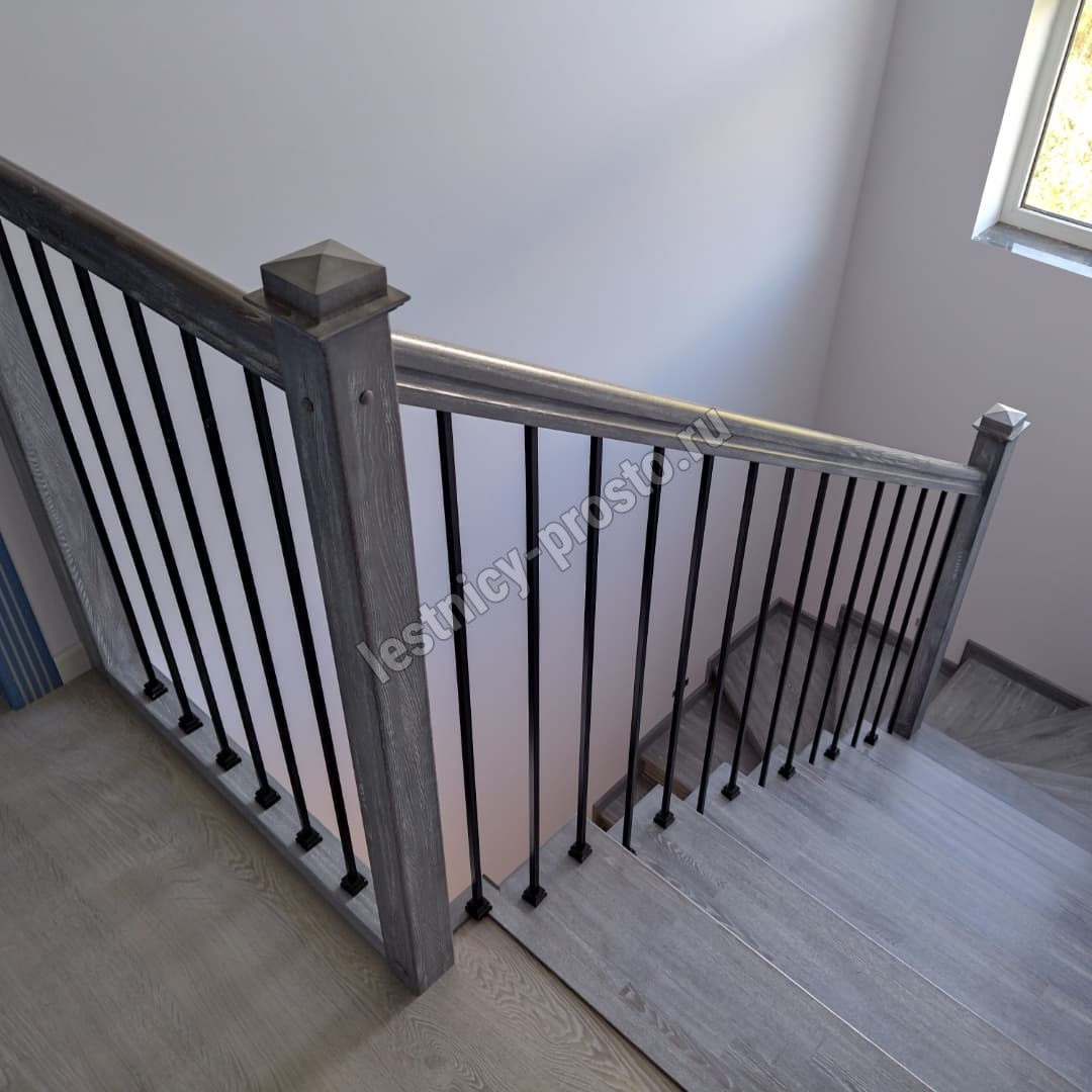 Ограждение: дубовые столбы и перила в сочетании с металлическими стойками, окрашенными порошковым способом в черный цвет.