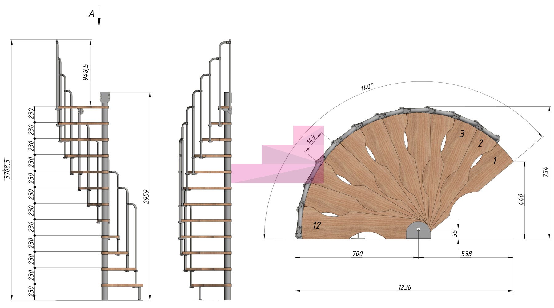 Винтовая лестница PROSTO MINI 70×140 см, h276-299 см