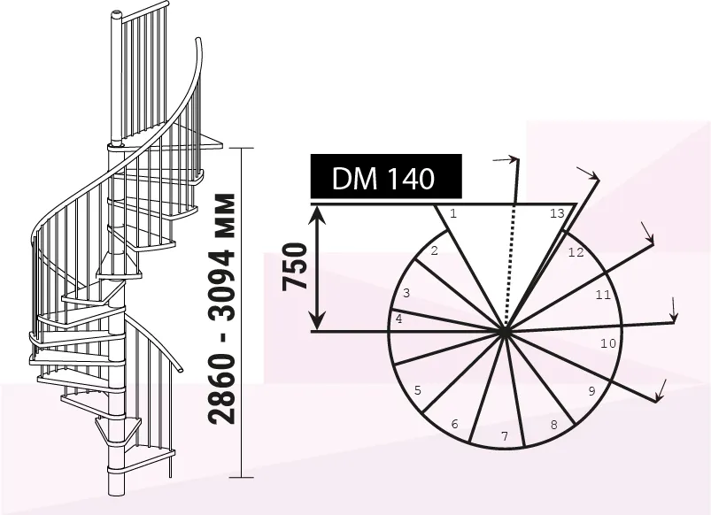 Лестница представлена в двух вариантах: с поворотом направо и с поворотом налево. Благодаря возможности регулировать высоту шага с помощью пластиковых вставок (входят в базовый комплект), высоту лестницы можно варьировать в пределах от 2860 до 3090 мм. Кроме того, купив дополнительную секцию для этой лестницы, можно поднять высоту до 3320 мм. Поручень изготовлен из массива дуба в тон ступеням. Ступени и поручень покрыты износостойким защитным лаком.