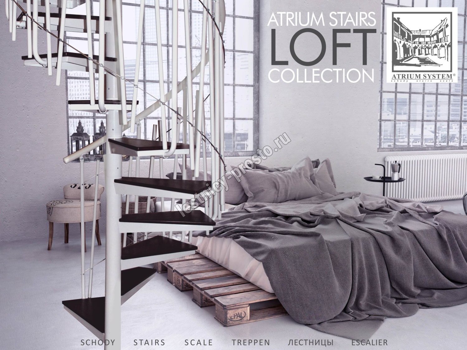 ATRIUM SOLO VERTICAL - это современная винтовая лестница, не требующая много места. Промышленный характер лестницы подчеркивают стальные тросы, используемые в балюстраде.