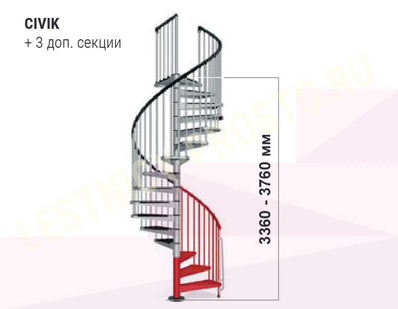 Ступени лестницы покрыты специальными накладками из износостойкого антискользящего материала. Площадка лестницы имеет универсальную форму, позволяющую встраивать лестницу в потолочные отверстия любой формы и размера. Высота лестницы регулируется при установке. С помощью специальных дополнительных секций, высоту лестницы можно увеличить до 3760 мм. (Секции покупаются отдельно). Во время сборки, задаётся необходимое направление поворота лестницы. CIVIK изготовлен из штампованной стали, окрашен в черный цвет (RAL 9017), белый (RAL 9010) или серый (RAL 9006). Отделка лестницы всегда в черном цвете. Перила из полиуретана с алюминиевым сердечником черного цвета, как и износостойкие нескользящие панели на ступенях.
